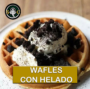 Incluye 1 Wuafle de tamaño promedio y Bola de helado sabor Napolitano decorado con chocolate liquido y baston de galleta.